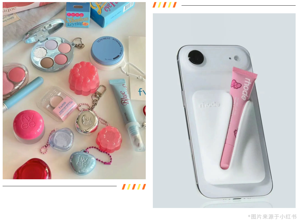 2025年,国货彩妆品牌罗小曼则借 “小黄豚联名系列” 再造“断货王”,以萌趣设计激发购买欲;美妆品牌Rhode推出内置润唇膏的手机壳,风靡全球;韩国美妆品牌Fwee凭借“唇颊两用布丁膏钥匙扣”火爆出圈……